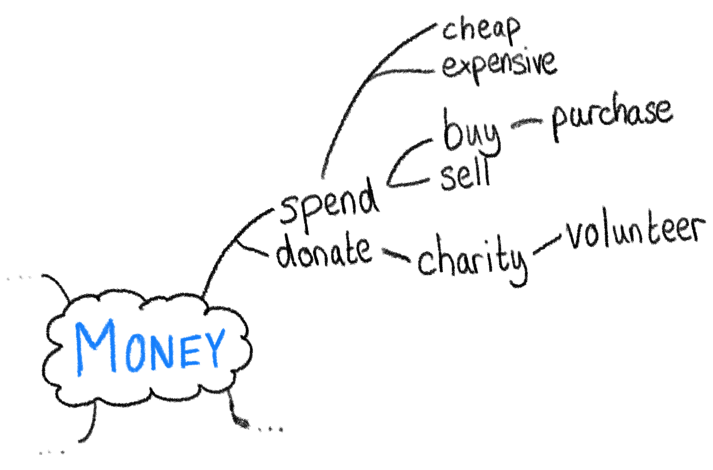 In the centre, you could have a topic or word that you want to focus on. For example, you could have the word "environment" or something more specific like "money". Then, think about all the words that link to it and write them down. You could go further and think about which words link to the new words, and so on.