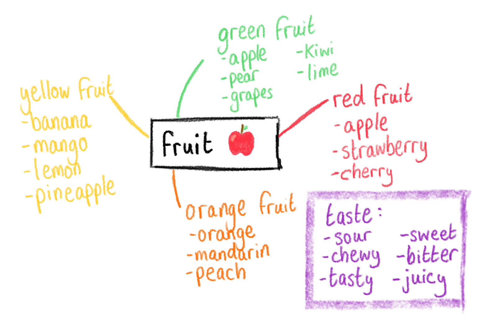 This example shows how you can use mindmaps to focus on types of things, in this case: fruit. You can also add extra information that doesn't quite fit in boxes around the mindmap. This is particularly useful when there are words from a certain word class that you want to highlight, such as adjectives or verbs.