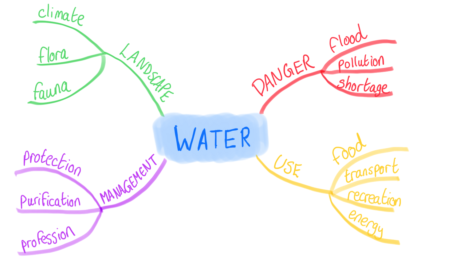 Mindmaps can be useful when thinking about a broad topic and trying to cut it down into different sections. This example shows how you can write down vocabulary for a variety of topics concerning water, such as how we use water, but also the dangers of water. Let your imagination go wild to truly test your vocabulary knowledge!